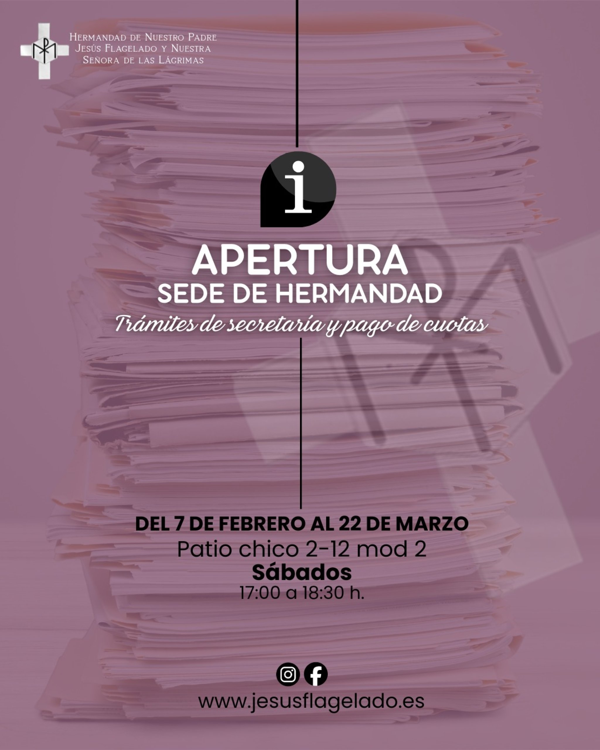 Durante este periodo de apertura, la sede será nuestro punto de encuentro y el lugar donde podremos realizar todas las gestiones necesarias relacionadas con la vida de la Hermandad. En este horario se podrán llevar a cabo trámites de tesorería y secretaría, realizar nuevas altas, gestionar todo lo relacionado con los hábitos, así como adquirir merchandising oficial.